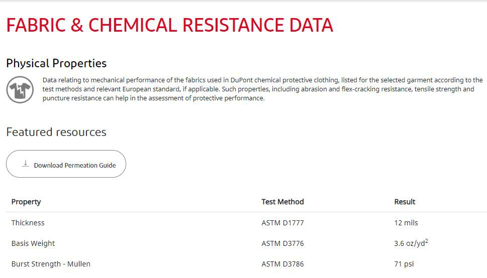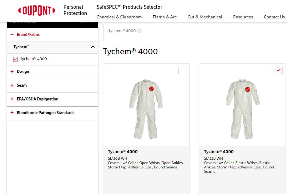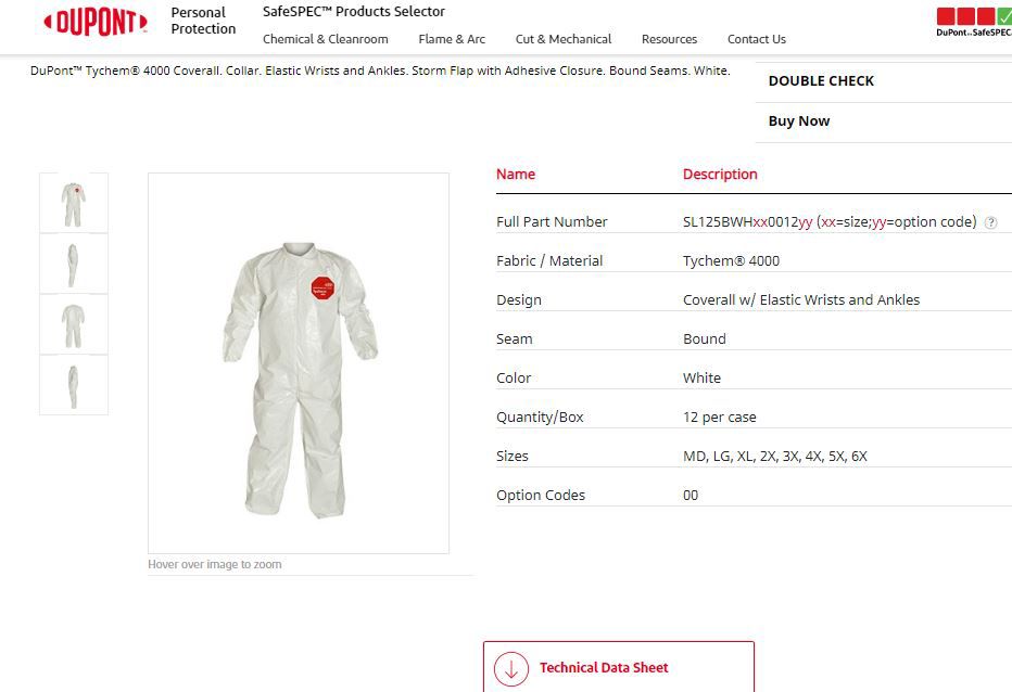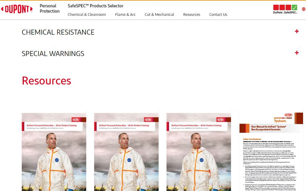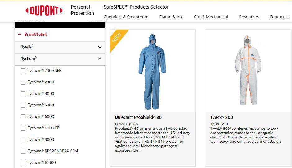 DuPont™ SafeSPEC™では、特定のデュポン™タイケム®生地の化学物質透過試験データを閲覧することができます。