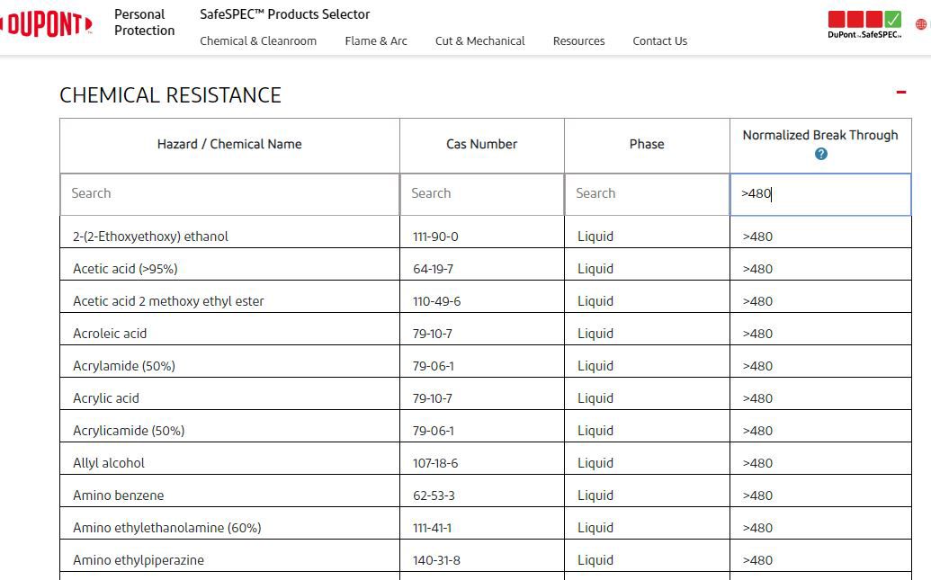 透過試験データ表をスクロールするか、または検索 を使用して、関心のある分野に的を絞ります。例えば、防護服生地が480分の耐透過性を持つすべての化学物質を特定するには、 標準破過時間 search barに「>480」と入力します。
